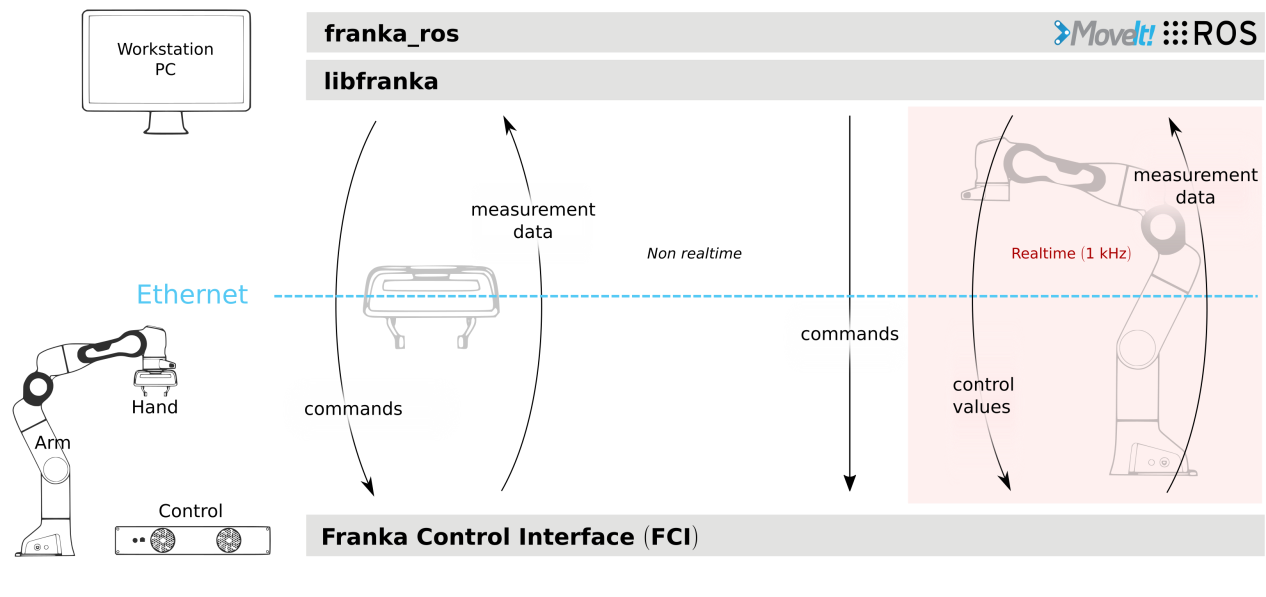Franka控制接口(FCI)允许与手臂和手进行快速直接的低级双向连接。它提供机器人的当前状态,并通过以太网连接的外部工作站PC实现其直接控制。通过使用我们的开源 C++接口libfranka,您可以使用5种不同的接口以1 kHz的频率发送实时控制值...