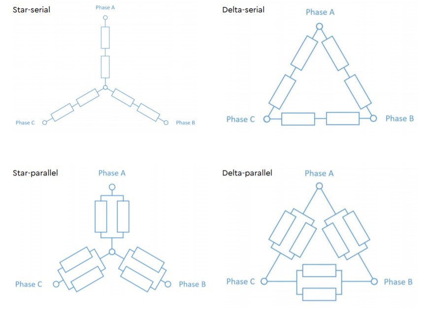 - ILM25*04、ILM25*08和ILM38*06的标准电压是24V,而且只有star-serial和star-parallel两种内部连接方式,其他型号的标准电压是48V(也可以使用在36V、24V、12V,使用电压不同,最大转速也会变化),大多有四种内部连接方式可供选择: