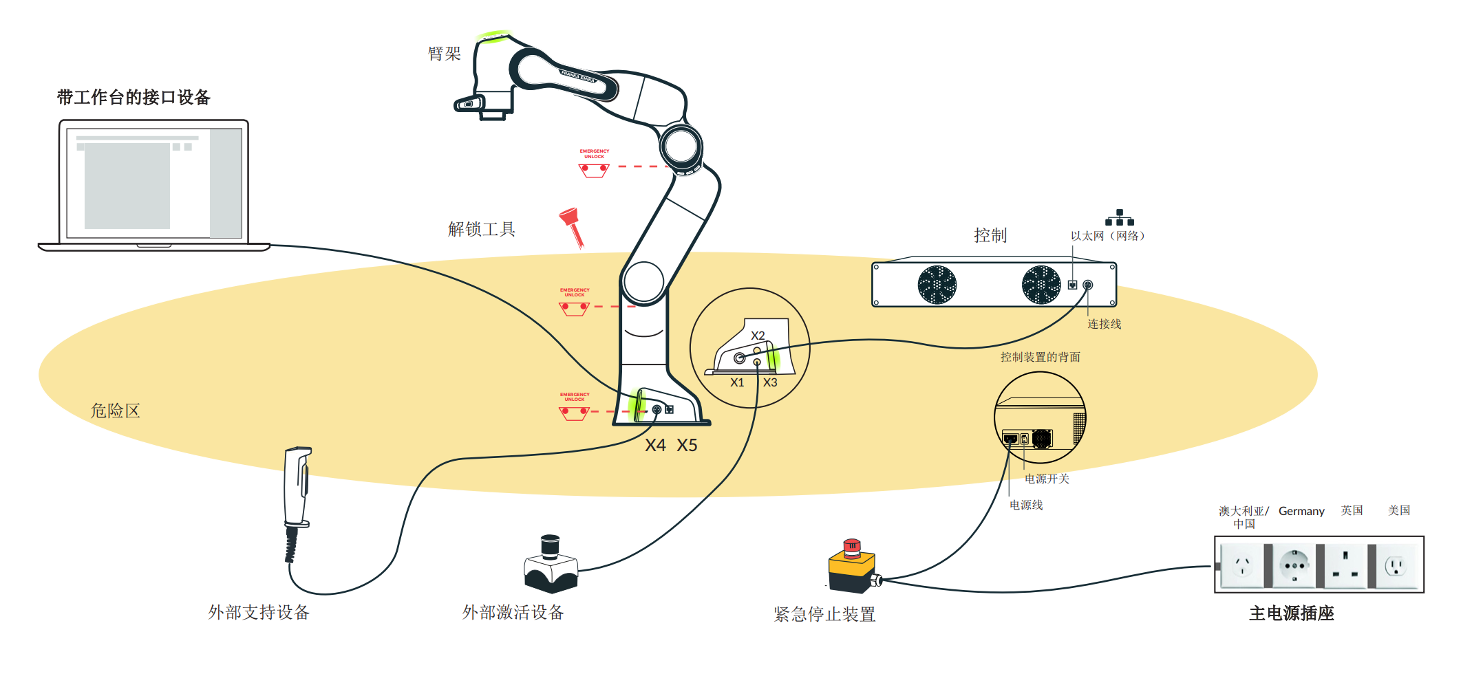 首先准备好一台机器人按照说明书要求安装好并按照图示连接线。