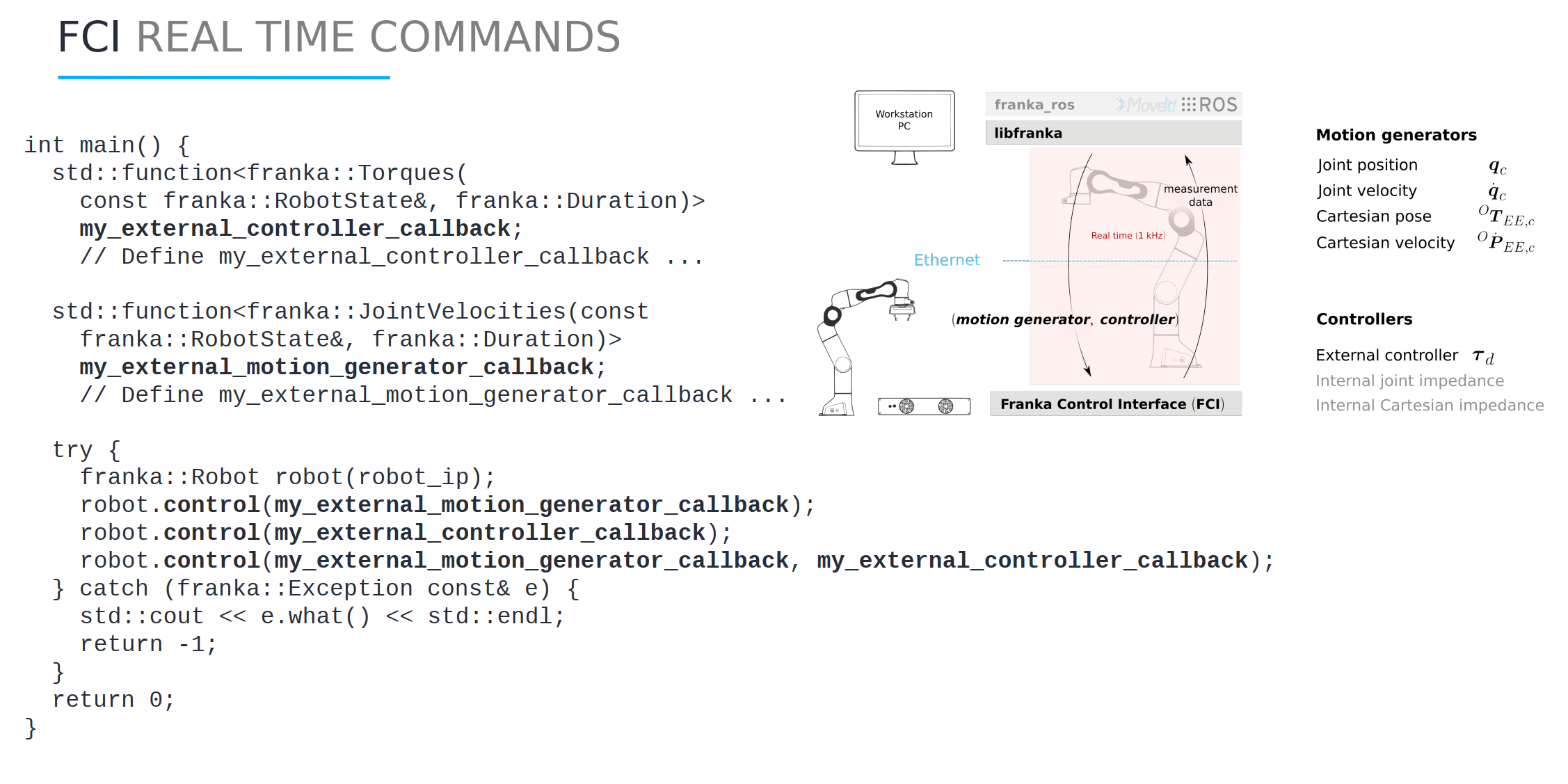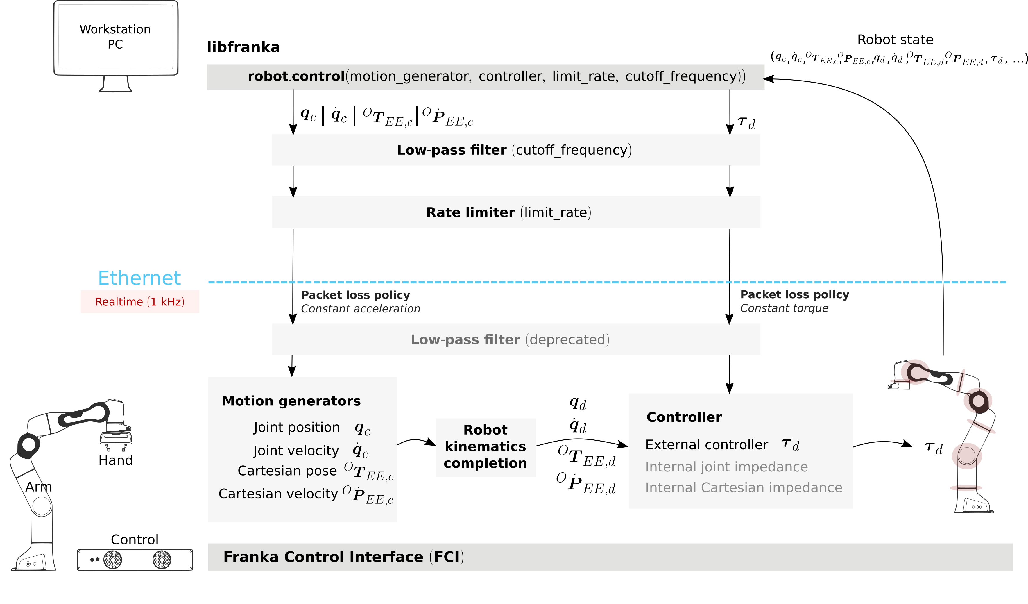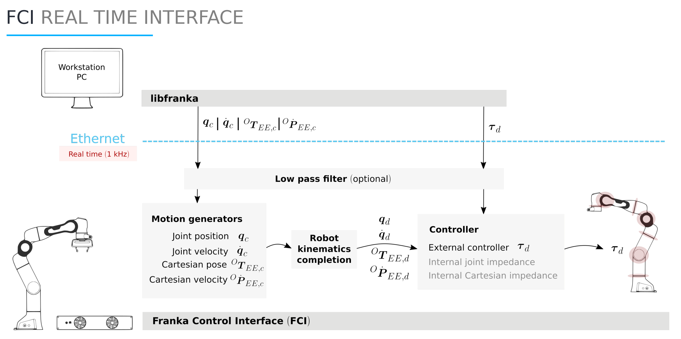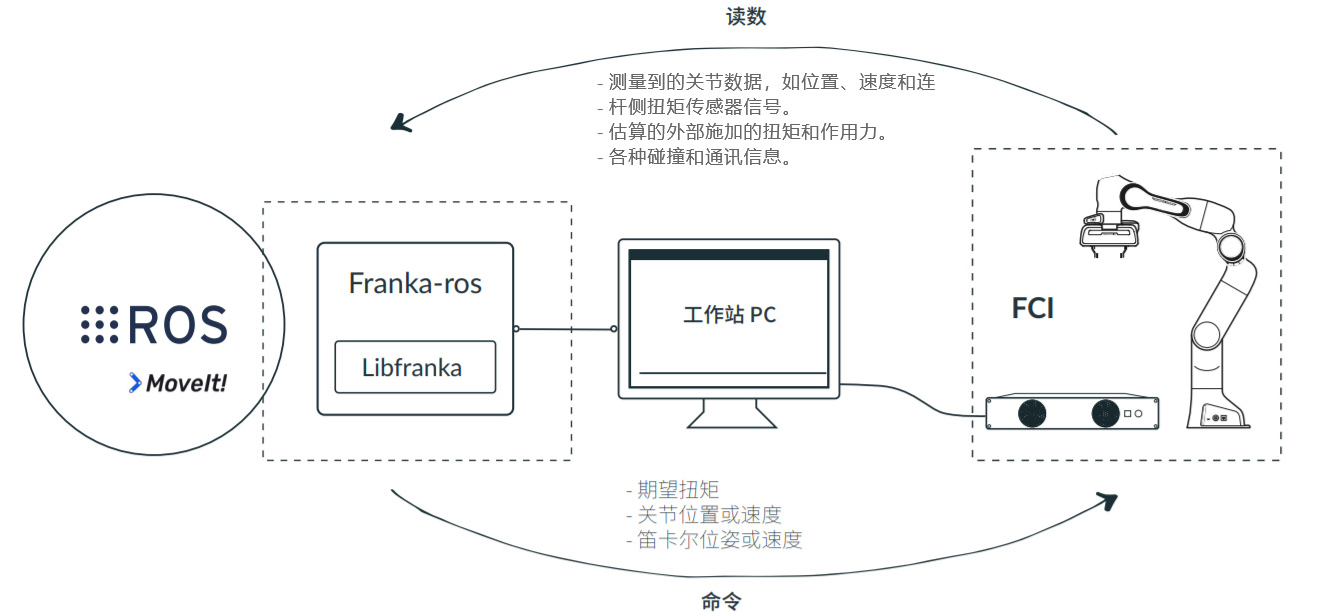 注意:Franka开源的是一个控制库,可以控制和读取关节级的位置、速度、扭矩、加速度、加加速度等等,但是单个关节内的控制环路都是不可以修改的,包括电流环 扭矩环也是不可修改的。